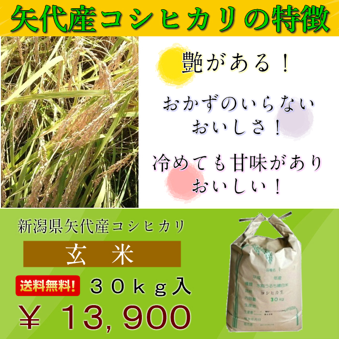 【期間限定販売】【送料無料】 令和1年度産新米 新潟県矢代産 コシヒカリ 玄米30kg