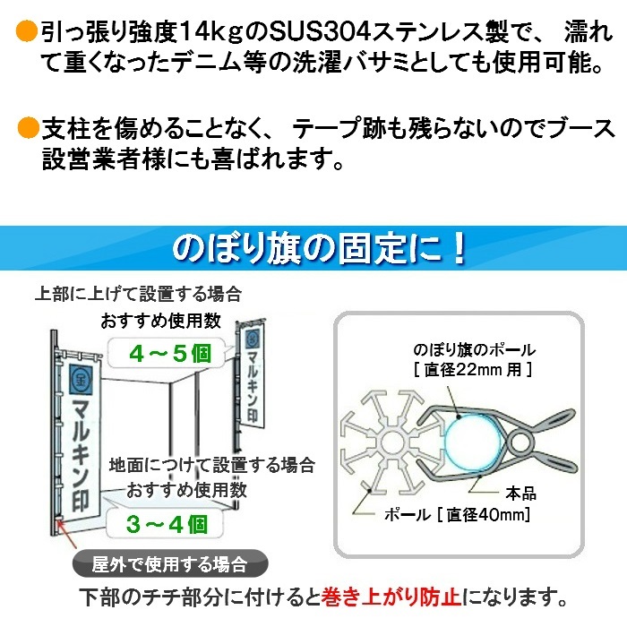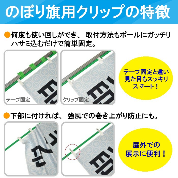 実用新案取得済、引張強度約14kg(工業試験場で検査済)の「のぼり旗用クリップ」を、ぜひご活用ください!