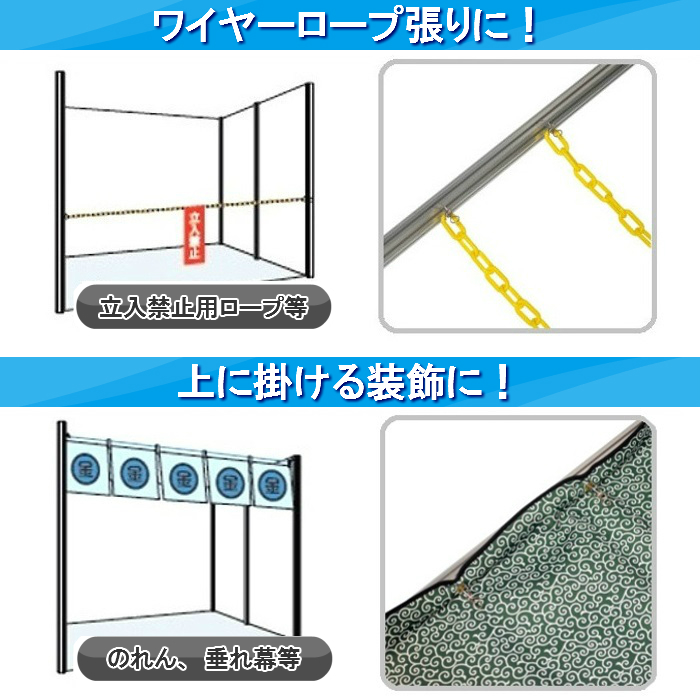クリップを支柱に付け、ロープやチェーンをつければブース内の空間装飾に、また侵入禁止の幕を支柱に止めることも簡単にできます。
