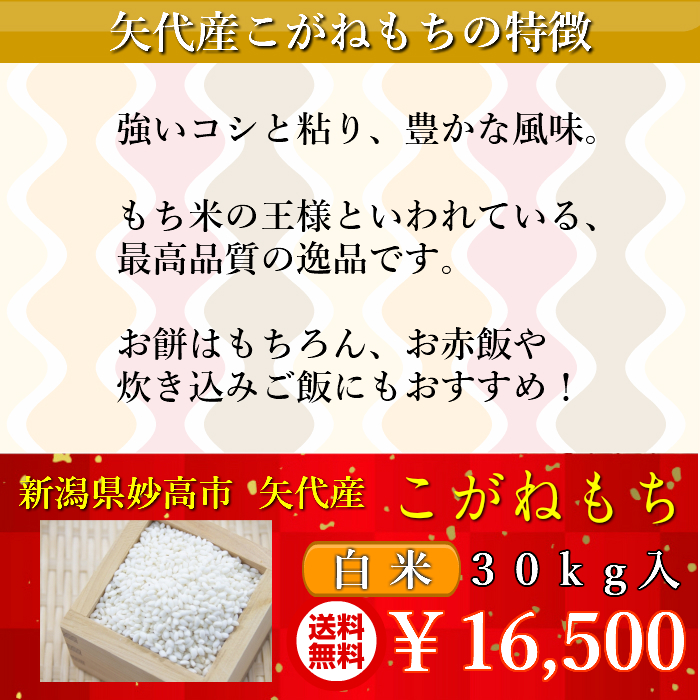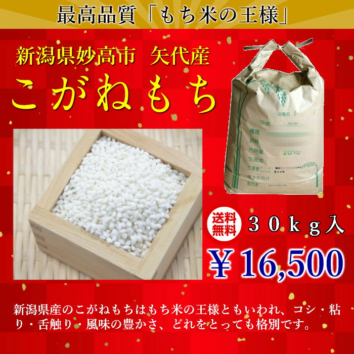 【期間限定販売】【送料無料】 令和1年度産新米 新潟県矢代産 こがねもち 白米30kg