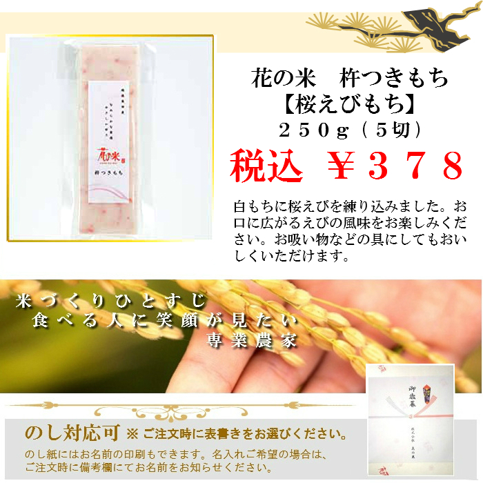 <販売期間:2019.12.04~2020.01.31まで> 【桜えびもち】 ■原材料:水稲もち米(新潟県特別栽培米こがねもち)、桜えび、塩 ■内容量:250g(5切) ■保存方法:直射日光が当たらない場所、高温多湿を避けて保存 ■販売者:株式会社 花の米 餅米の最高級品とされる「こがねもち」を使用した切り餅「桜えびもち」です。 白もちに桜えびを練り込んだ「桜えびもち」。 お口に広がるえびの風味をお楽しみください。 お吸い物などの具にしても美味しくいただけます。