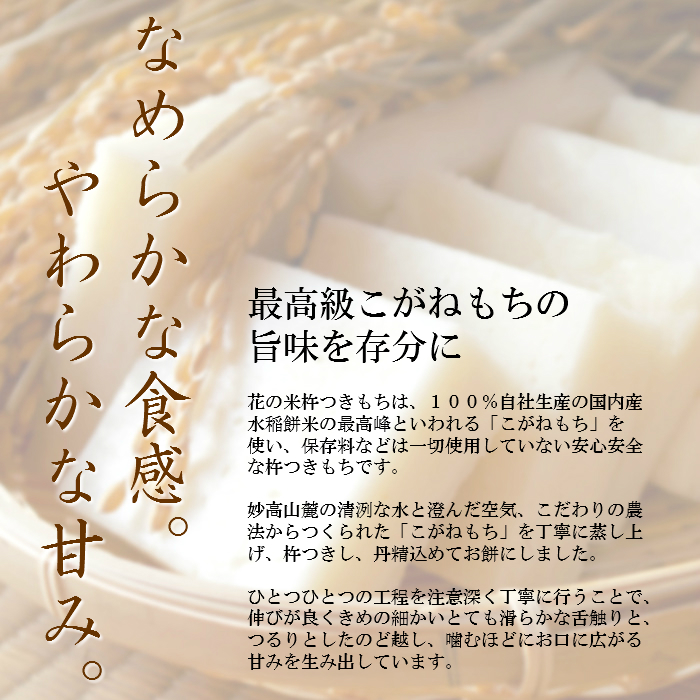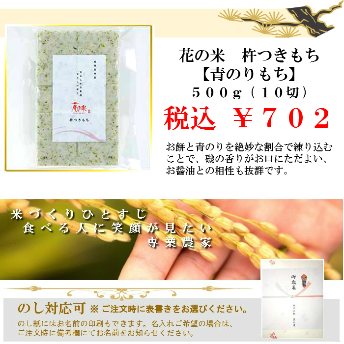 <販売期間:2019.12.04~2020.01.31まで> 【青のりもち】 ■原材料:水稲もち米(新潟県特別栽培米こがねもち)、青のり、塩 ■内容量:500g(10切) ■保存方法:直射日光が当たらない場所、高温多湿を避けて保存 ■販売者:株式会社 花の米 餅米の最高級品とされる「こがねもち」を使用した切り餅「青のりもち」です。 お餅と青のりを絶妙な割合で練り込むことで、 磯の香りがお口にただよい、お醤油との相性も抜群です。