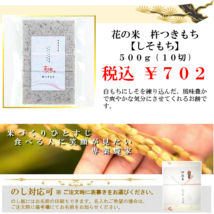 <販売期間:2019.12.04~2020.01.31まで> 【しそもち】 ■原材料:水稲もち米(新潟県特別栽培米こがねもち)、ゆかり ■内容量:500g(10切) ■保存方法:直射日光が当たらない場所、高温多湿を避けて保存 ■販売者:株式会社 花の米 餅米の最高級品とされる「こがねもち」を使用した切り餅「しそもち」です。 白もちにしそを練り込んだ、 風味豊かで爽やかな気分にさせてくれるお餅です。